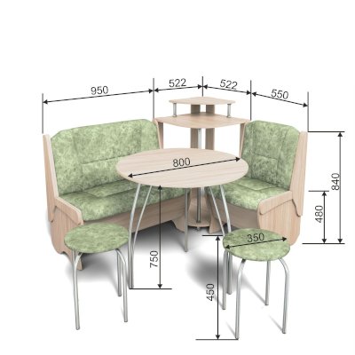 Оригинальный кухонный уголок Лотос отличается от других похожих кухонных гарнитуров. Он состоит из двух отдельных диванчиков и этажерки, заменяющей угловую мягкую часть. Круглый кухонный стол в отличие от других наборов мебели на металлическом основании как и два круглых табурета. Набор мебели для кухни включающий в себя большую прямую скамью,малую прямую скамью,угловую этажерку, стол на металлических ногах и два табурета на металлокаркасе. В прямых скамьях под сиденьями расположены ящики.